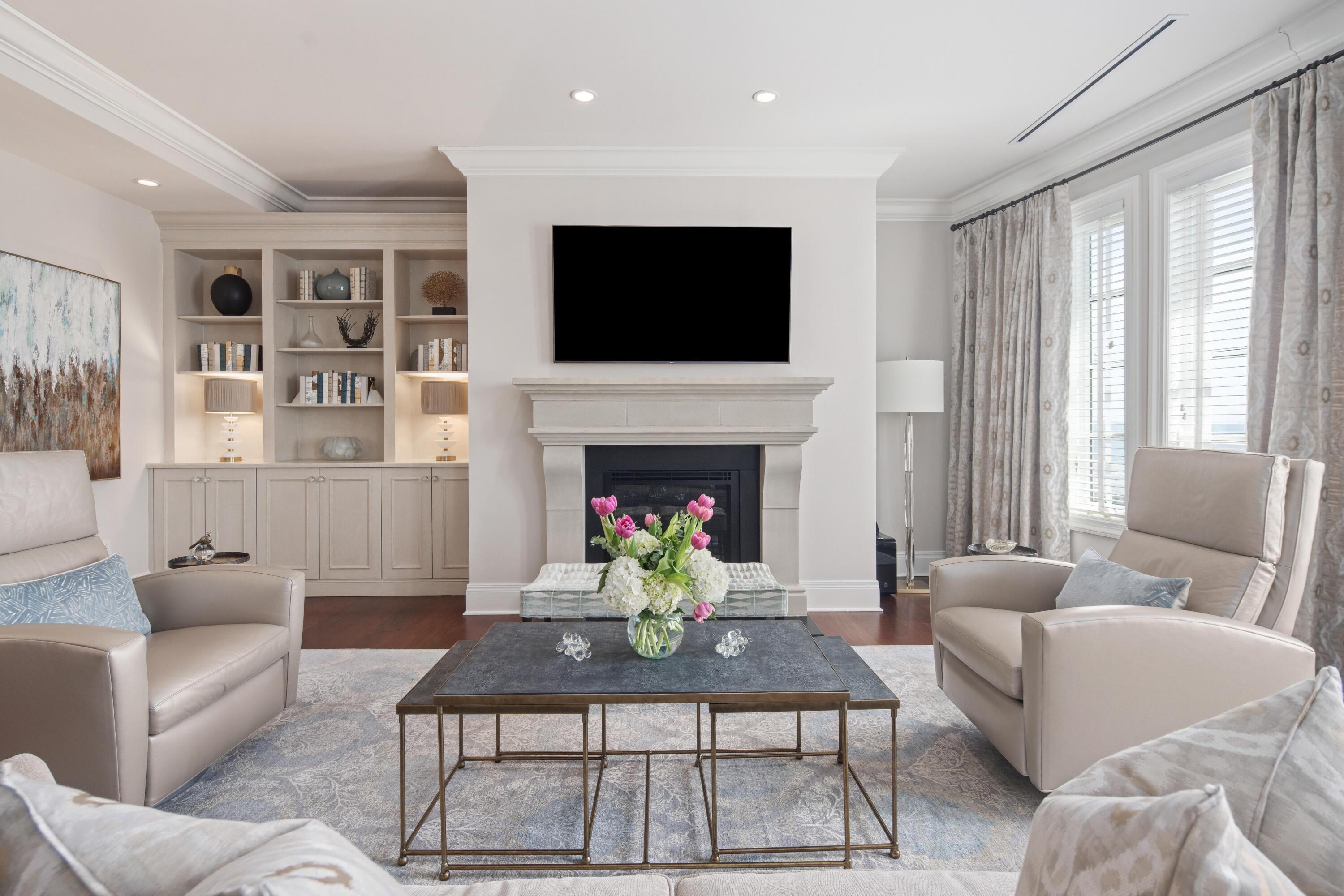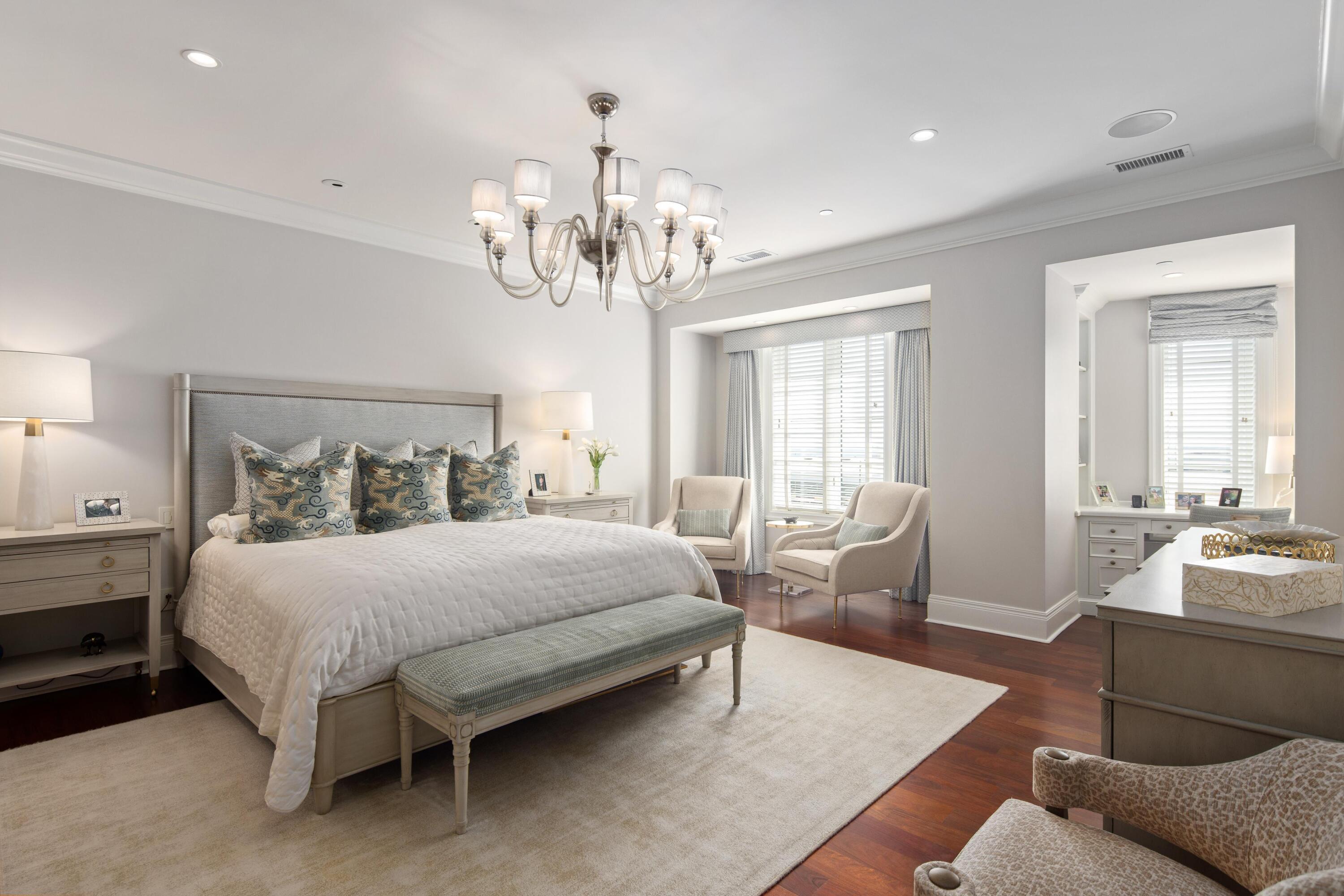 Large windows frame glimpses of the harbor and the surrounding historic skyline, bringing natural light into the gracious living spaces and enhancing the home's serene atmosphere.